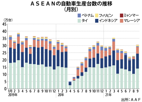東南アジア諸国連合(ASEAN)の9月の自動車生産・販売台数は、前月比でともに3割以上増えた。新型コロナウイルスの変異株「デルタ株」流行を受けた市場の冷え込みは7月に底を打ち、2カ月連続で回復基調をたどっている。