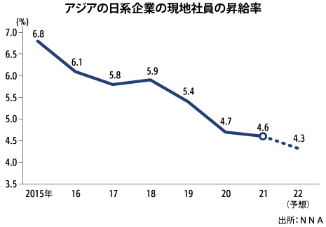共同通信グループのNNA(東京都港区)の調査によると、アジアで事業展開する日系企業の現地社員の2022年昇給率は前年比4.3%と、21年比で0.3ポイント低下する見通しだ。21年の昇給率は4.6%と前年より0.1ポイントの低下にとどまったが、22年はさらに低下することになる。