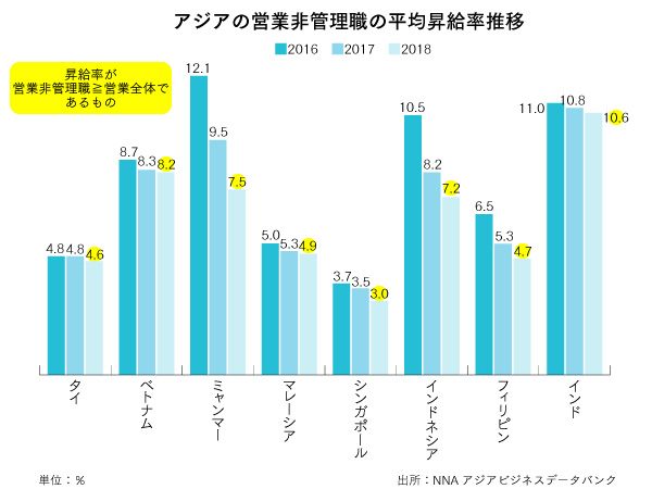 NNAがアジア各地に進出している日系企業に対して2017年9月に実施した給与動向調査(有効回答2,238社)によると、18年はアジア各国で営業の非管理職の昇給率が、営業全体の昇給率をほぼ上回る見通しだ。各国別では、ベトナムの営業の非管理職の昇給率は8.2%と、営業全体の7.0%を1.2ポイントも上回った。インドネシアも非管理職が7.2%と、営業全体の6.8%より0.4ポイント高い。タイやミャンマー、マレーシア、シンガポール、インドなども同様の傾向となっている。