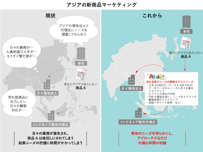 ネクスウェイは、東南アジアの日系企業1万3,000社、ローカル企業100万社のリストを持つ。顧客の求めに応じてこのリストを製造業や小売業、病院、学校、レストランなど業種ごとに細かく分類し、ある特定の製品やサービスに対するニーズの聞き取りやアポイント取りなどまでも行う、営業・マーケティングサービス「AS-aP(アサップ)」を日系企業向けに提供し、好評を博している。
