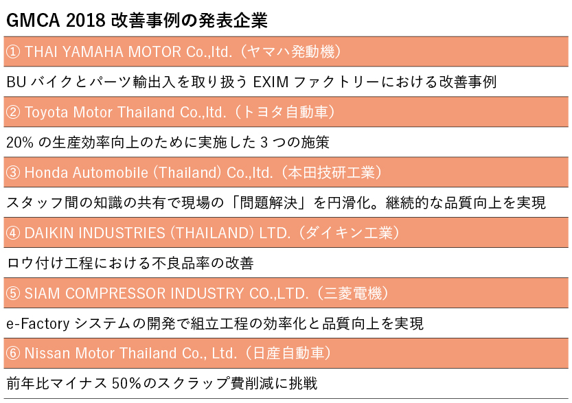 GMCAは、16年の第1回大会の参加者が260名、昨年は410名と毎回規模を拡大しており、3回目の今年は600名の参加を見込んでいる。発表者もトヨタモーター・タイランド(トヨタ自動車)を筆頭に、タイ・ヤマハモーター(ヤマハ発動機)など日本とタイのものづくりを第一線で支える企業6社がエントリーしている。