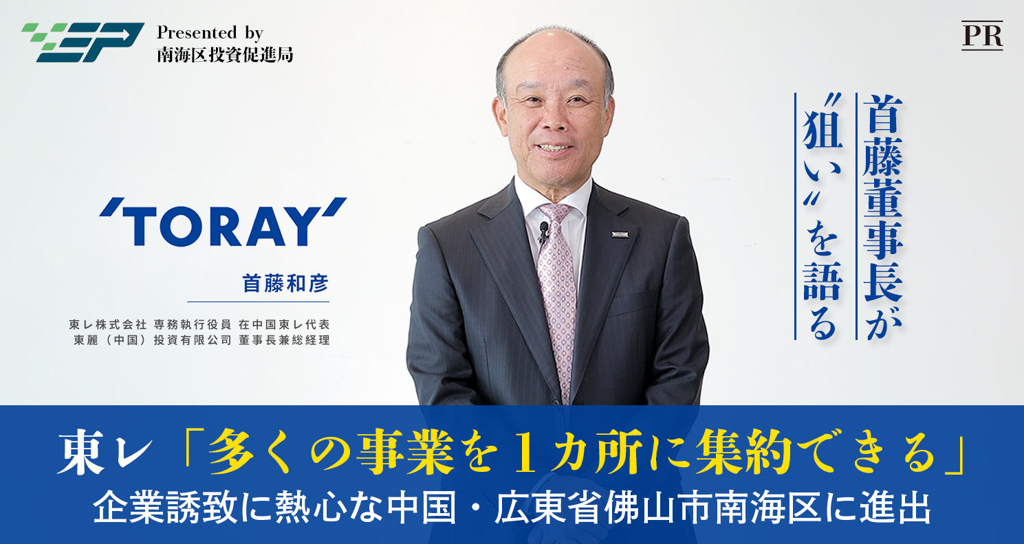 広東省といえばGDPが数年連続で中国全国の首位に立っており、言わずもがなの中国経済成長への貢献が大きな地域だが、東レ(東京都中央区)は2017年、広東省佛山市南海区に新たな製造拠点を設立した。外資の中でも日系企業の誘致に力を入れる地元南海区の支援を全面的に受けた形だ。南海区は04年、企業進出をサポートする「投資促進局」を創設。以後、自動車関連企業を中心に日系企業約125社がこの地域に集結している。広州や香港に近いという立地で、中国国内の総合実力上位100区ランキングで8年連続の2位を誇る南海区。東レの専務執行役員、在中国東レ代表、東麗(中国)投資有限公司の董事長兼総経理を務める首藤和彦氏に南海区進出の経緯や狙いを聞いた。