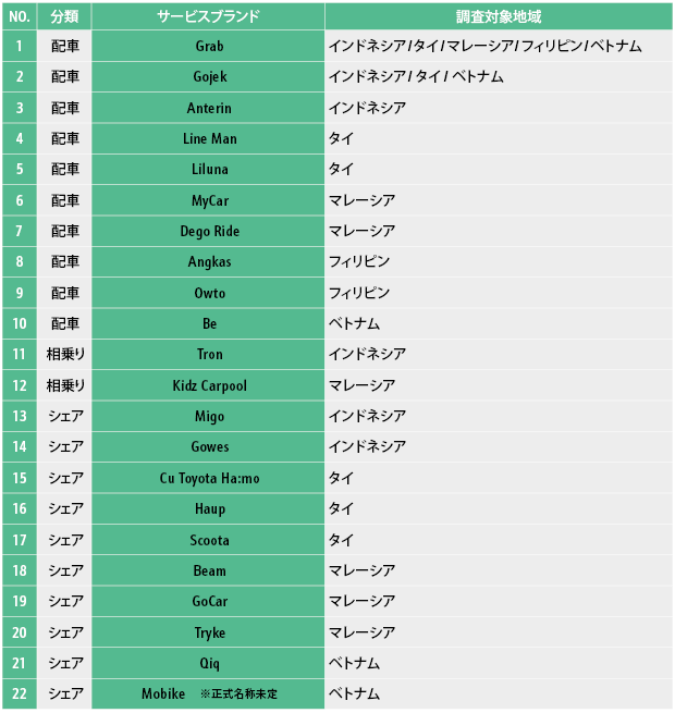 日々進化を続けるモビリティーサービスのエコシステム。NNAでは、インドネシア、タイ、マレーシア、フィリピン、ベトナムの5カ国を対象に、各地でモビリティーサービスを展開するプレーヤー28社(22アプリ)の事業実態について調査いたしました。