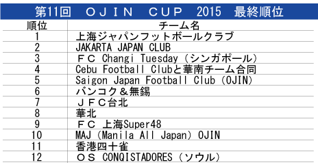 決勝戦は上海JFが2得点を決め、ジャカルタを制した。今大会のMVPは上海JFの平井知之さん(43)が選ばれた。平井さんは6得点を決め、得点王にも選出された。最高齢得点賞にはジャカルタの田中徹さん(63歳4カ月)が輝いた。このほか、今回が初出場となったサイゴン・ジャパン・フットボールクラブ(OJIN)で参加した中村真理恵さんもゴールを決め、盛大な拍手が送られた。
