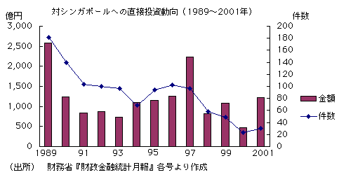 しかし現実の日本企業の対東アジア投資額の動向をみると対中国投資は増加の一途をたどっているが、日本企業の対シンガポール投資は減少傾向をたどっている(前ページ図参照)。1990年139件、1,232億円だった日本対シンガポール投資は94年には69件、1,101億円に減少し、さらに2000年には23件、468億円とボトムを記録した(『財政金融統計月報』より)。