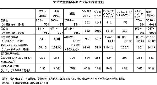 つまりは90年代から2000年初頭にかけて、他の地域同様、日本の対シンガポール投資は減少の途をたどっているのである。それはゆえなきことではない。表をみていただきたい。これはアジア各都市の賃金・事務所賃貸料・インターネット接続料・TOEFL平均点数・IMD(スイスの経営開発国際研究所)のランキングを調べたものである。中国の上海と比較するとシンガポールの投資条件は決して優位にはない。それゆえに多くの企業は中国への投資活動を強めているのである。