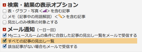 「メール通知」のエリアで「すべての記事の見出し一覧」をチェックしてください。メール本文にすべての記事見出しの一覧がプラスされてお手元に届くようになります。