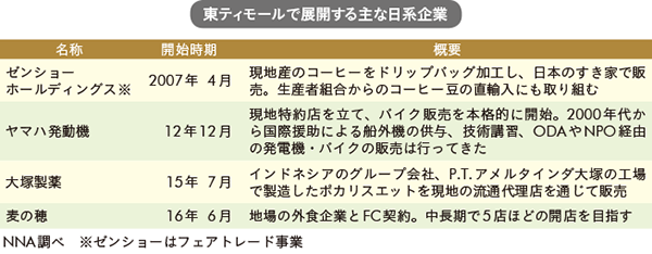 日系企業の進出は極めて少ないが、日本製品が販売されている様子は頻繁に見かける。魅力は何といっても参入余地の大きさ。FCや代理店契約など身軽な形で行える業態が向いているだろう。東ティモール人は、ティモール西部(インドネシア領)に出向いて食品や日用品を仕入れている。インドネシア経由でルートを開拓することも可能だろう。(NNA カンパサール編集部 岡下貴寛)