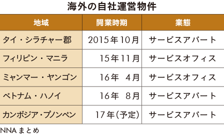 レオパレス21の国際事業では、サービスアパートメント(部屋の清掃などホテルのようなサービスが付くアパート)やサービスオフィス(業務に必要な備品や設備に加え、共有の会議室などを備えたオフィス)の運営も手掛ける。海外初の自社運営物件は、15年10月にタイ・チョンブリー県のシラチャー郡でオープンしたサービスアパートだった。