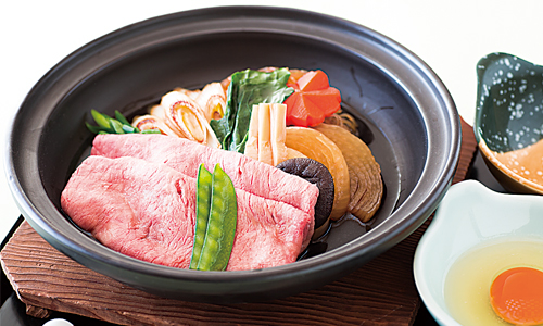 上海の山里では「牛すき煮鍋」を独自メニューとして提供している。すき焼きのようだが、肉を焼かずにタレに付けてから火を通すことで、肉から溶け出した旨みと甘みを野菜にまで染み渡らせることができるのが特徴だ。以前は中国の高級牛「雪龍黒牛」を使っていたが、大森料理長の任期中に入手が困難となってしまい、現在は上海で手に入る中で最も高級なオーストラリア産牛肉を仕入れている。上海では魚と同様、脂が乗った肉が人気で、こうしたこだわりのある現地でより質の良い霜降りを探すのは苦労したそうだ。