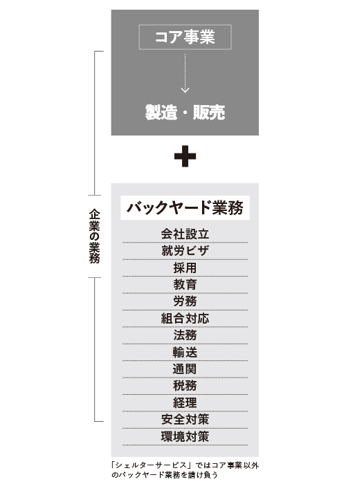 最近は進出企業が増え、現地人マネジャーや技術者の獲得競争により人件費が上昇しており、より付加価値の高い製品の製造・販売が必要な環境になっています。メキシコでは、会社設立や経理、法務、人材採用、組合対応などのバックヤード業務を請け負う「シェルターサービス」があります。これを活用すれば企業は製造・販売のコア業務に集中できるようになります。