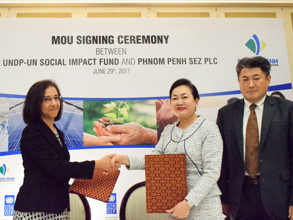 プノンペンSEZなどを運営するプノンペンSEZ社(PPSP)は6月29日、UNDPの社会インフラ事業に資金協力する「ソーシャルインパクトファンド」に選ばれ、覚書を交わした。カンボジアの事業が選ばれたのはPPSPが初めて。UNDPが投資家とPPSPの仲介役となり、社会インフラの支援に乗り出す。