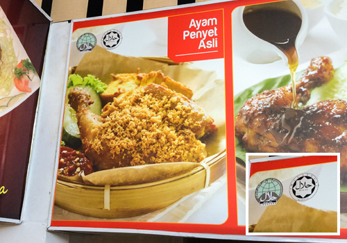 レストランのメニュー。マレーシアとシンガポールのハラル認証を取得していることを表示