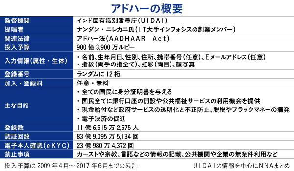 アドハーに詳しいIT専門家はアドハーについて「誰もが社会の一員になれる環境を生み出した」と評価する。アドハーは脱税や不正蓄財された違法な資金(ブラックマネー)の摘発、資金洗浄(マネーロンダリング)の防止にも利用され始めた。政府は16年11月の高額紙幣刷新や今年7月に導入した全国統一税制、物品・サービス税(GST)で地下経済をあぶり出し、低水準にとどまる納税率を引き上げようとしてきたが、アドハーで個人の資金の流れを管理する体制をさらに強化した。