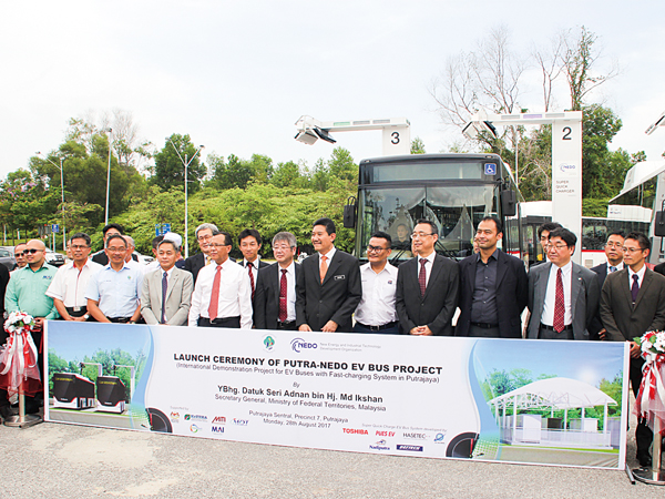 NEDOは2015年、EVバスの導入によるスマートコミュニティーの実現を目指すプトラジャヤ市と基本協定書を交換。超高速充電、耐久性で競争力を持つ電気自動車(EV)向け蓄電池を既に世界市場に展開する東芝インフラシステムズ(川崎市)、EVバスメーカーのピューズ(東京都千代田区)、超高速充電器とシステムを開発するハセテック(横浜市)、オリエンタルコンサルタンツグローバル(東京都新宿区)の4社との連合で、マレーシア側と連携してEVバスシステムの実証事業を推進してきた。