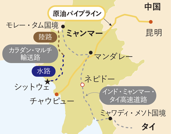 内陸の中国の雲南省とインド北東部にとって、ミャンマーは外洋に抜ける要衝で、両国は覇権を争う。中国は今年5月、ミャンマー西部ラカイン州と雲南省を結ぶ原油パイプラインを稼働、マラッカ海峡を通らず中東などの原油を本土へ運べるようになった(図1)。ラカイン州では中国国営企業が経済特区の開発権も得ている。インドも対抗するように、同国北東部からラカイン州の州都シットウェまでを道路と河川でつなぐ輸送路や、タイまで3カ国をつなぐ高速道の整備を目指している(図1)。
