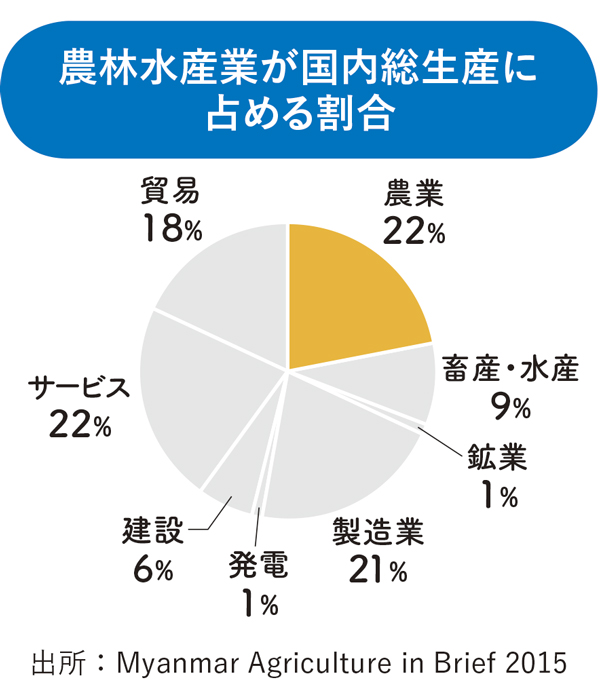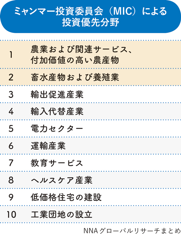 ミャンマー投資委員会(MIC)による投資優先分野が今年6月に発表された。農業や輸出促進産業、インフラ整備などへの投資が奨励されている。なかでも農林水産業は、国内総生産(GDP)の約3割を占めるミャンマーにおいて重要な産業のひとつだ。また、輸出額全体の約23%が農業製品であり、農村部労働者人口のおよそ7割が農林水産業に従事している。