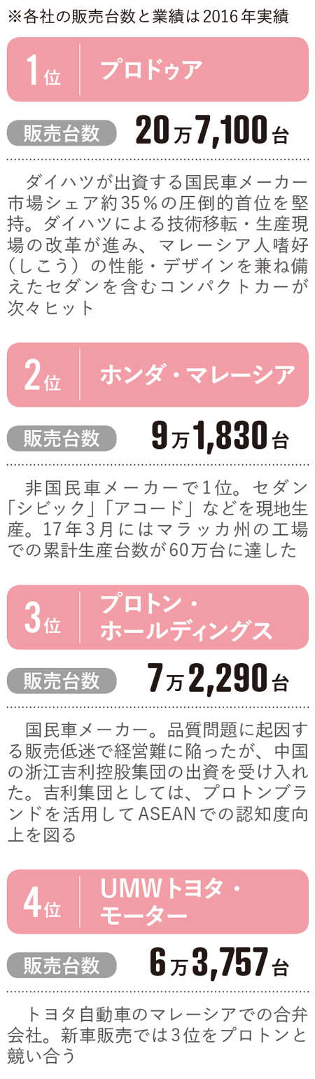 トヨタと3位を競ってきた国民車メーカーのプロトンは品質問題に起因する販売低迷で経営難に陥り、17年には中国の浙江吉利控股集団の出資を受け入れた。18年から抜本的な事業改革が始まる見通し。