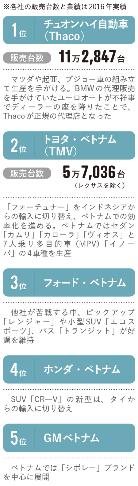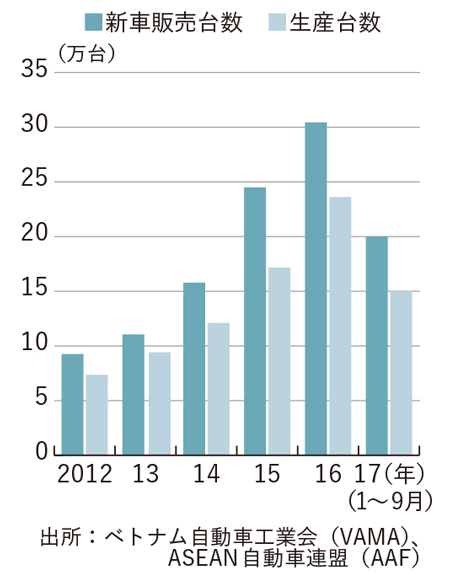 堅調な経済成長や安定した政治により、ベトナムの新車販売台数は16年に初めて30万台を突破した。しかし、18年の乗用車のASEAN域内の関税撤廃を前に、17年は消費者による買い控えが続き、各社は軒並み販売数を減らした。18年はその反動が期待されるが、各社は17年に大規模な販促を実施済みで、年明け以降の需要を結果的に先食いされているとの指摘もある。