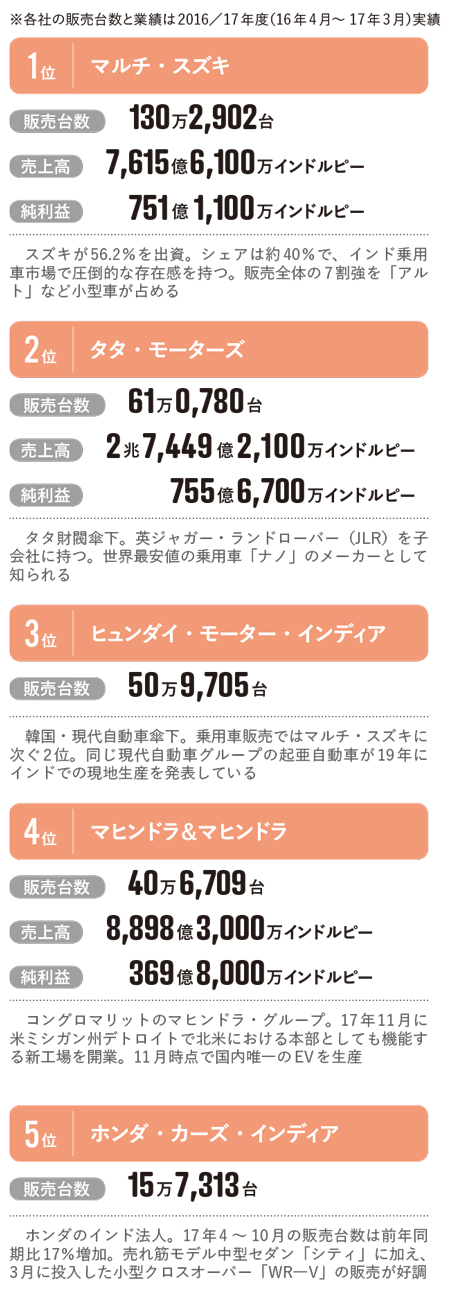 政府は、30年までに国内の自動車の大半を電気自動車(EV)に切り替える目標を掲げている。17年7月に導入されたGSTでは、ハイブリッド車(HV)に比べてEVの実効税率を低く設定するなど、EV重視の姿勢を示している。マルチ・スズキを傘下に持つスズキとトヨタ自動車は、20年をめどにインド市場向けにEVを投入することに関して、覚書を締結したと11月に発表。トヨタ自動車は、インド政府のEVシフト寄りの政策を受け、インドでセダン「カムリ」のHVの生産を一時停止するなど戦略見直しの可能性もある。業界2位のタタ・モーターズは、「世界一低価格の乗用車」として話題を集めた小型車「ナノ」のEVモデルを近く公表する見通しだ。