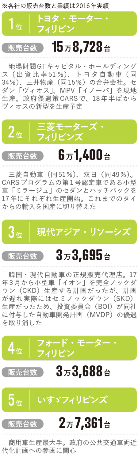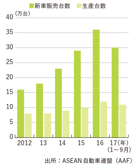 一方で生産台数の規模は小さく、産業の集積は進んでいない。需要は主に輸入車で賄われ、販売台数に輸入車が占める比率は7割に達しているとされる。ただ政府は自動車の現地生産を後押しする「包括的自動車産業振興戦略(CARS)」プログラムを推進し、トヨタ自動車と三菱自動車の2社が現地生産を加速しようとしている。