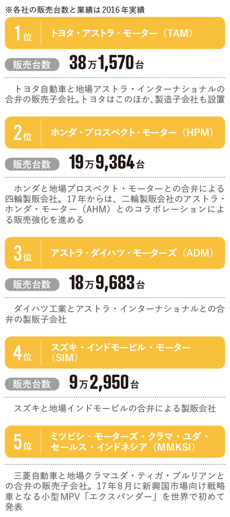 インドネシアでは多目的車(MPV)の人気が高い。17年には5位の三菱自動車が現地生産の小型MPV「エクスパンダー」の出荷を開始し、話題となった。中国・上汽通用五菱汽車も低価格のMPV「コンフェロ」を発表し、日系メーカーの牙城であるMPV市場への食い込みを狙っている。