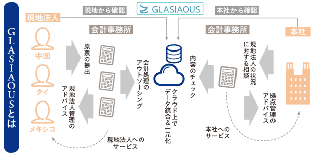 現地法人の内部リスク対策などの要望に一元で応えられるのが、海外グループの財務情報を効率的に管理する仕組みを日本企業向けに提供しているクラウド型国際会計アウトソーシングサービス「GLASIAOUS(グラシアス)」だ。現地法人から提携する会計事務所に原票を提出すれば、アウトソーシングで会計処理が行われ、クラウド上でデータを一元管理できる。現地からも本社からも同じデータを確認できるようになり、“見える化”が実現する。日本本社から、現地法人の財務諸表から仕訳の明細確認までを感覚的に操作が可能だ。日本語と英語だけでなく、タイ語、ベトナム語を標準サポートしており、項目名だけでなく、データも多言語に対応しているため、現地法人にとっても“見える化”が実現できるのだ。