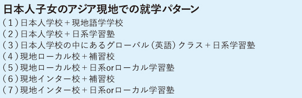 アジア各地に駐在する日本人家庭の子女が現地で就学する形には複数パターンがあります。