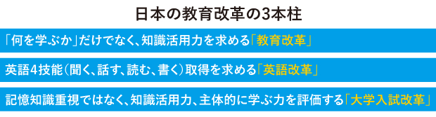 日本では2020年から、戦後最大規模の教育改革が行われようとしています。具体的には、下図の3本柱です。