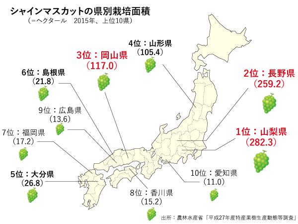 さらに、シャインマスカットは貯蔵性に優れ、輸送中に果実が房から落ちてしまう脱粒が少ないため、輸出に向いているという流通側の利点もある。