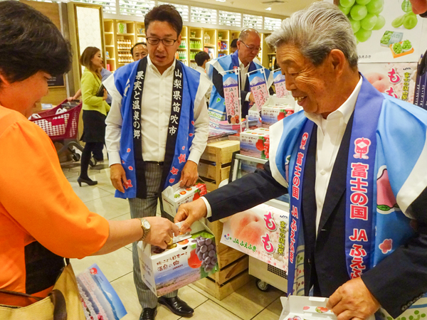 フルーツ王国・山梨県の中でも特に果物の生産が盛んな笛吹市は8月9~10日に、KL市内の高級スーパーで、山下政樹市長によるトップセールスを実施。名産のモモやブドウをアピールした。笛吹農業協同組合の小池一夫代表理事組合長によると、シャインマスカットは日本国内でも人気が高く、常に品薄の状態。ここ数年全国で生産量が伸びているにもかかわらず、価格は高騰しているという。ただ、「日本では価格が手ごろな小ぶりのものが好まれる一方で、海外では日本では売れにくい大ぶりで高価なものが好まれるという違いがあるため、品薄と言われる中でも安定して輸出向けの商品を確保できている」(小池氏)といい、引き続き輸出に力を入れていく方針だ。