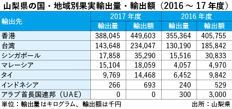 山梨県農政部で輸出支援を担当する草間聖一氏によると、物産展やトップセールスなどの一時的なプロモーションのみならず、現地の卸業者と提携を強め、地場の高級スーパーなど恒常的な販売網を確立したことも、輸出増加につながった。