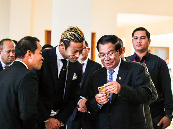カンボジアのフン・セン首相(右)は、本田選手のGM就任について「自主的に引き受けてくれたことに感謝する」と自身のフェイスブックに投稿(フン・セン首相のフェイスブックより)