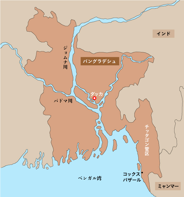 コックスバザールのあるチッタゴン管区はミャンマーと国境を接している。ミャンマーを追われて同地に流入したイスラム教徒、ロヒンギャ難民の問題が国際的な関心を集めている。