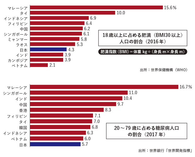 アジア諸国では、経済成長に伴うライフスタイルの変化などを背景に、生活習慣病である糖尿病の患者が増えており、その割合は軒並み日本を上回る。また、運動不足や脂分の多い食習慣などから、都市部を中心に肥満や過体重が大きな問題となってきている。一方で、アジアの人々の健康増進に対する意識は着実に高まっており、日本の健康・スポーツビジネスにとって、有望市場といえる。