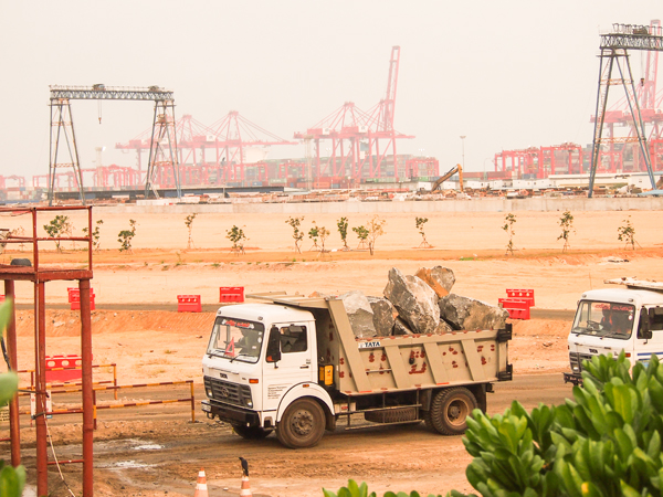 ãã³ãã³ããŒã¿æž¯ãèŠæž¡ãå Žæã«ç«ã€ãšãæ°åå°ã®èªåè»ã枯湟ã«çã眮ãããŠãããéåœã»çŸä»£èªåè»ãã€ã³ãåéšãã§ã³ãã€ã§çç£ããèªåè»ã ãã€ã³ãæ±æµ·å²žã®æž¯æ¹Ÿã®ã»ãšãã©ã¯å«æ°Žãæµ ã倧åè¹ã®ç岞ãã§ããªãããã®ãããèªèµ°ã§ç©ã¿èŸŒããå°åROROè¹ã§ãã³ãã³ããŒã¿ãŸã§èŒžéããã¢ããªã«ã欧å·è¡ãã®å€§åROROè¹ã«èŒãæããŠããã幎é7äžå°ä»¥äžãèŒžå ¥ãããæ¥æ¬è£œäžå€è»ãç眮ãããŠããã