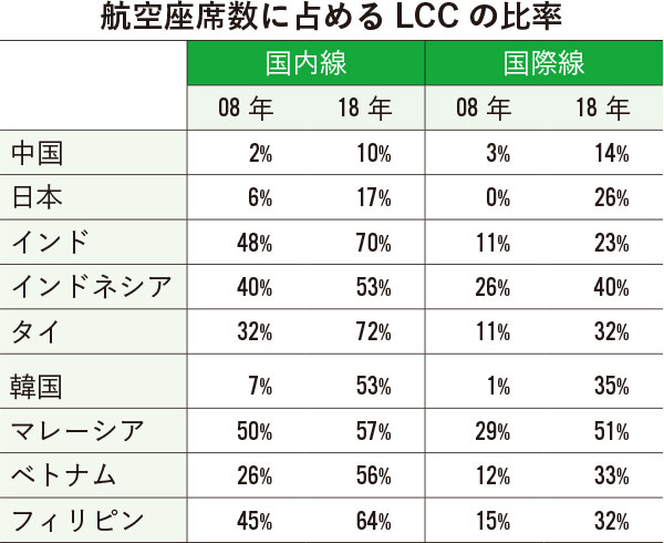18年はインド、インドネシア、マレーシア、フィリピン、韓国、タイ、ベトナムの7カ国が国内線の供給座席数に占めるLCCの割合が50%を超えた。マレーシアは国際線でも50%を超え、インドネシアも40%に達した。