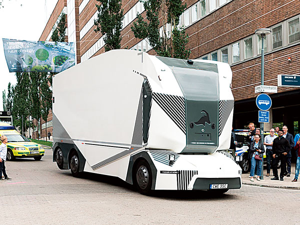 スウェーデンの自動運転スタートアップ企業エインライド(Einride)は5月15日、世界初とされる運転台なしの自動運転トラック「T―pоd」の公道走行実証を開始した。スウェーデン南部のヨンショーピング市にあるドイツ鉄道(DB)物流部門シェンカーの施設で、来年末まで実施。エインライドはシェンカーのほか、通信・電機大手エリクソン、コンチネンタルや独格安スーパー「リドル」とも提携済み。写真はストックホルム近郊での6月の公道実験。