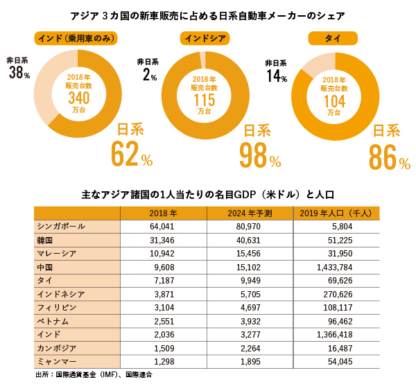 アジアは日本の完成車メーカーにとって重要な位置を占める。1人当たりの国内総生産(GDP)が3,000米ドル(約32万円)を超えると本格的な自家用車普及(モータリゼーション)が到来するとされるが、それぞれ人口1億人前後を抱えるフィリピンやベトナムがこれに相当し、さらに14億人の巨大市場インドが次に控える。一方、すでにモータリゼーションを迎えたインドネシアとタイでは、それぞれ日系メーカーのシェアが98%、86%と圧倒的な存在感を示し、マレーシアでも42%に達している。