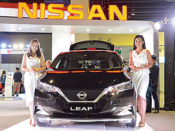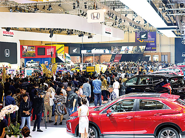 4月に開かれた「マレーシア・オートショー2019」を視察する同国のマハティール首相(手前、NNA撮影)