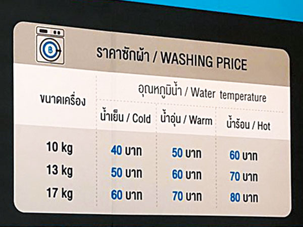 キッサダワン氏は、オッテーリの特徴として「使い勝手の良さ」と「快適さ」を挙げる。店内には、料金体系や洗濯機・乾燥機の使い方がタイ語と英語で掲示されている。料金は10~17キログラムで水温により40~80バーツ。コインランドリーでは仕上がりまでに通常1時間程度かかるが、30~40分で仕上がる洗濯機を導入し、店内ではWi―Fi(ワイファイ)を無料で提供している。