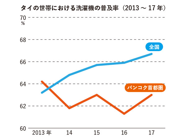 タイ国家統計局(NSO)によると、タイの世帯における洗濯機の普及率は17年時点では66.7%。13年から徐々に上昇しているものの、上昇ペースは緩やかだ。バンコク首都圏(ノンタブリ県、パトゥムタニ県、サムットプラカン県を含む)における普及率は17年時点で63.0%で、13年以降、上昇と下降を繰り返している。