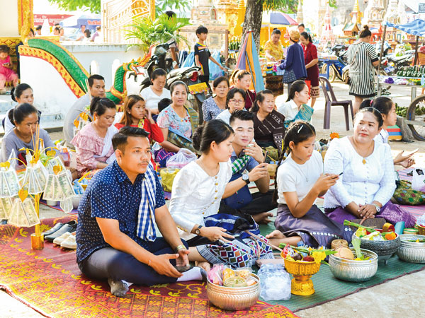 中心部のメコン川沿いに建つ「Wat Na Bo(ナ・ボー寺院)」では7月16日、仏教の雨安居(雨期に若い出家僧が一定期間寺にこもって修行する)の行事が行われており、早朝から多くの市民が正装して僧に托鉢(たくはつ)するもち米、菓子、生花などを持ち寄っていた。