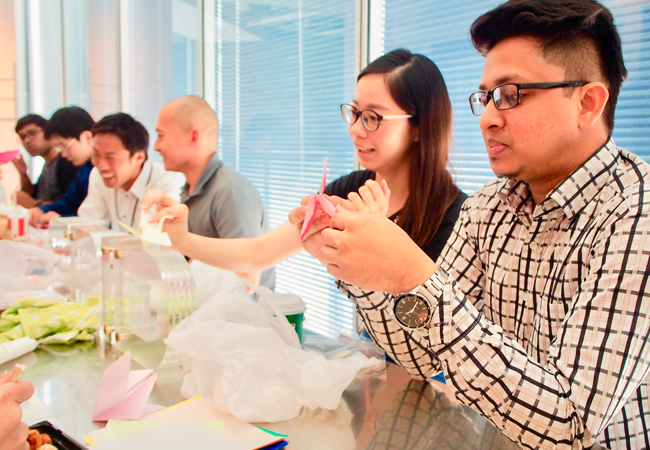 グリッドは、日本人と外国人の社員が一緒に英語で会話をするランチの場を設けている(同社提供)