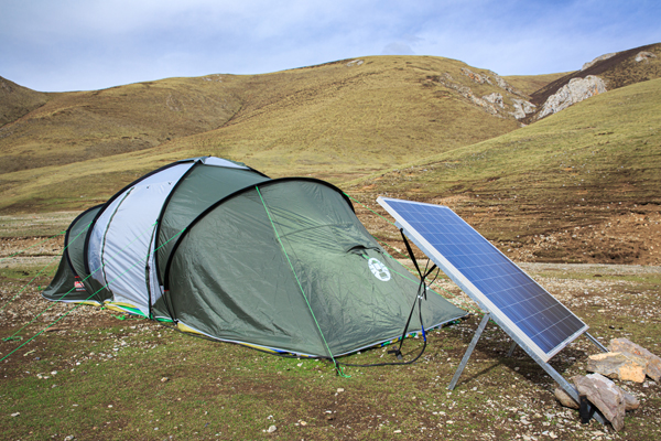 テント外に設置したソーラーパネル。テント内には巨大なバッテリーとコンバーターがある