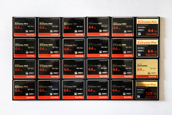 CFカード。万一の破損に備え、リスク分散をしてあまり大容量のものは用いない