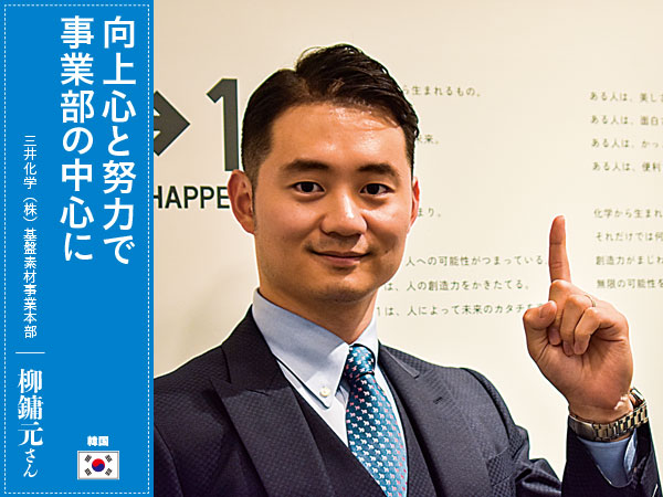 韓国・ソウル市出身の柳鏞元(ユー・ヨンウォン)さんは、三井化学で汎用プラスチックの原料となる高純度テレフタル酸(PTA)などを取り扱うPTA・PET事業部に所属する。マーケティング・セールス担当として外内部環境分析や取引先との価格交渉、物流合理化のための包材のデザイン変更まで、業務は多岐にわたる。