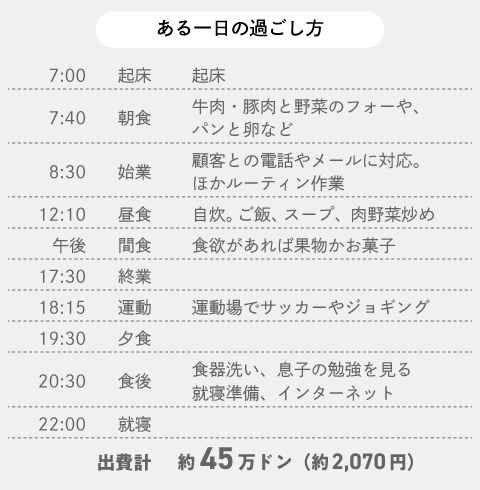 外食や遊興費がかからないため、この日の支出は食費、バイクのガス代、子供の飲料代などで約45万ドン(約2,070円)。現在は、週末にはプールで水泳をしたり、書店に本を見に行ったりすることができるようになっているという。