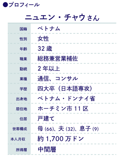 ホーチミンの日系通信コンサルティング会社に勤めるチャウさん。出身も同市で、11区にある持ち家の戸建てに、母、画家の夫、小学生の息子と暮らしている。今年4月1日から5月3日まで、政府の規制により在宅勤務を行った。ベトナムは新型コロナウイルスの感染が他国に比べて少なく抑えられたため、社会の正常化が早くから進められていた。