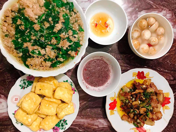 左上から時計回りに、①カニスープ「具は畑に住む小さいカニ、野菜、ヘチマ」(チャウさん)、②ニョクマム。揚げ豆腐につけて食べる、③白い小ナスの漬け物「カーモゥイ」。「日本の梅干しのようなもの」(同)④肉玉ねぎ炒め、⑤小ナス用調味料マムトーム、⑥揚げ豆腐=(チャウさん提供)